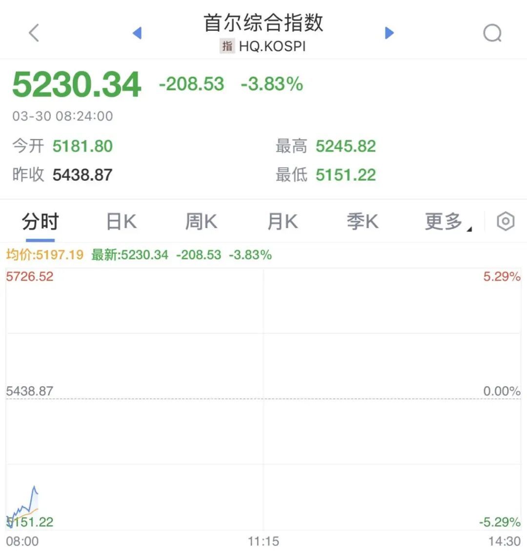 3月30日配资讨论网,日韩股市大幅低开,日经225指数一度跌超5%,最新报50869.3点。
